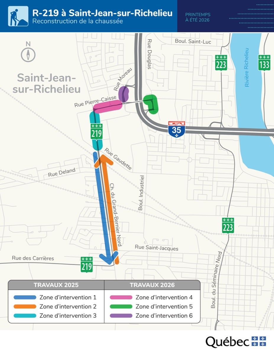 Le ministère des Transports et de la Mobilité durable informe la population que les travaux de reconstruction de la chaussée de la route 219 (Chemin du Grand-Bernier Nord), entre l’autoroute 35 et la rue des Carrières, à Saint‑Jean‑sur‑Richelieu, se poursuivront à compter du 27 avril prochain et s’échelonneront jusqu’au mois de juillet.