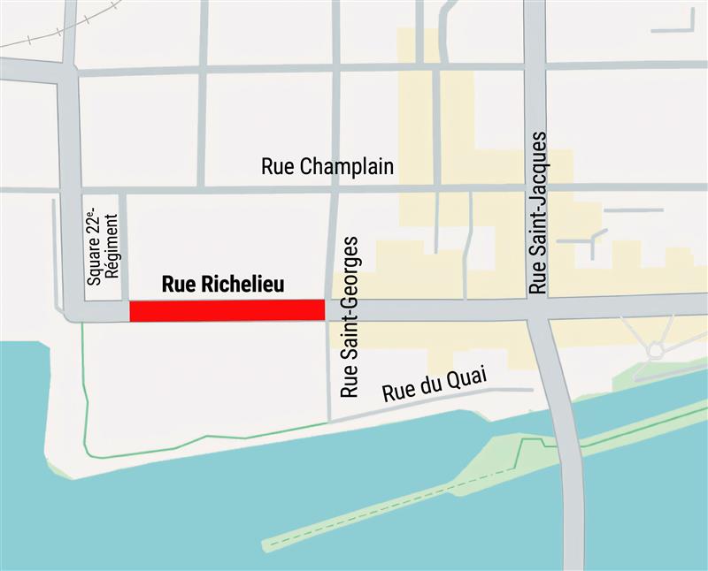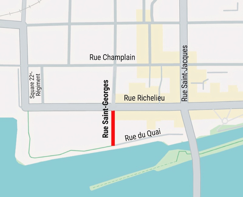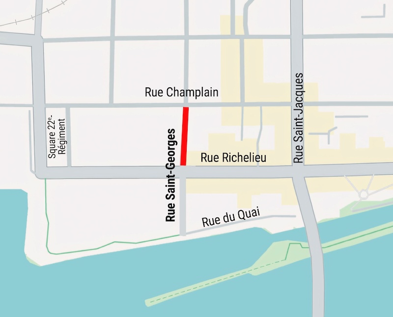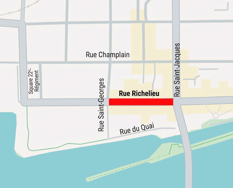 Ce chantier concerne la rue Richelieu, entre les rues Royal-22e-Régiment et Saint-Jacques ainsi que la rue Saint-Georges, entre les rues Champlain et du Quai.