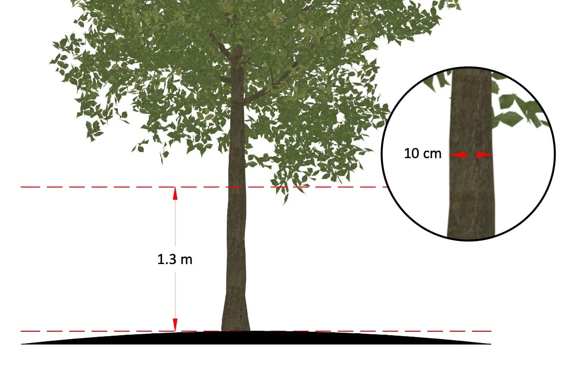 - Le diamètre de l’arbre de remplacement mesuré à hauteur de souche (DHS) doit être d’au moins 50 millimètres pour un feuillu et s’il est un conifère, sa hauteur doit être d’au moins 2 mètres;